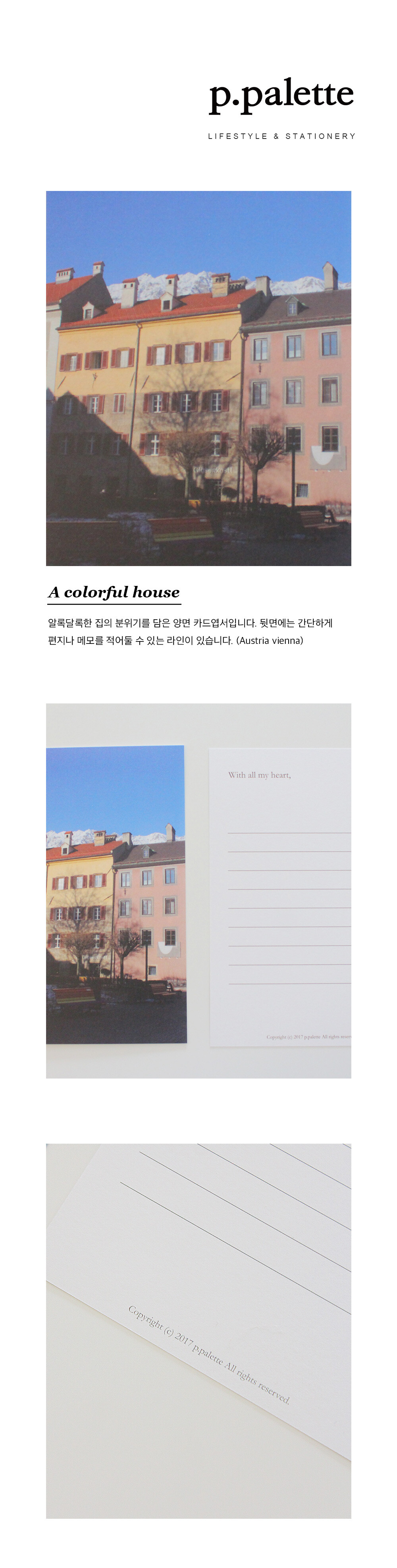 알록달록한 집의 분위기를 담은 양면 카드엽서입니다.