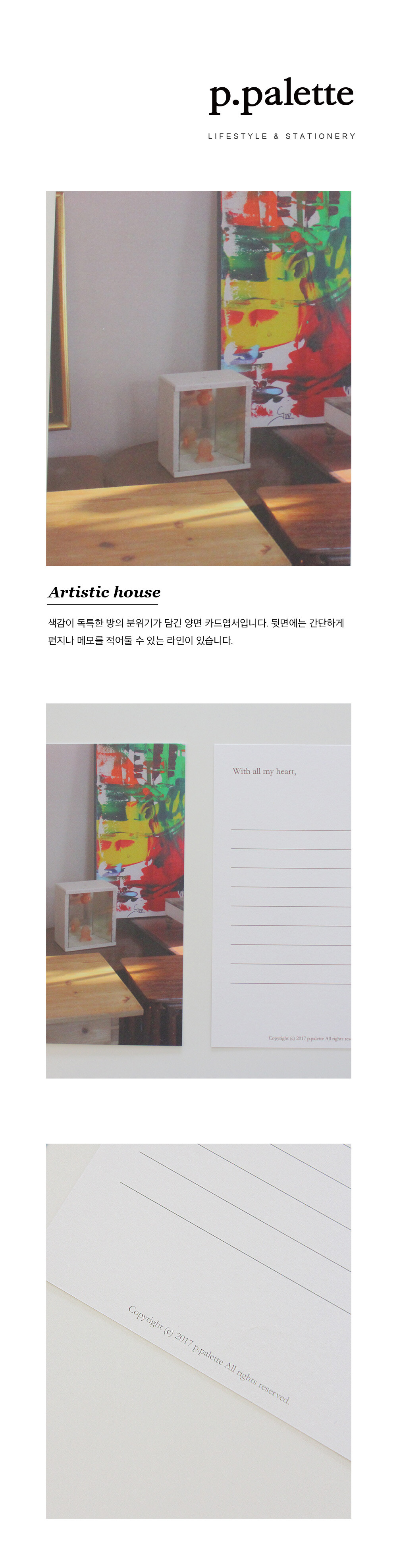 색감이 독특한 방의 분위기가 담긴 양면 카드엽서입니다.