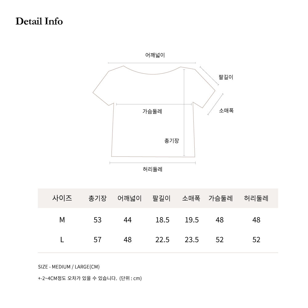 총기장 53 / 어깨넓이 44 / 가슴둘레 48 / 허리둘레 48 / 팔길이 18.5 / 소매폭 19.5